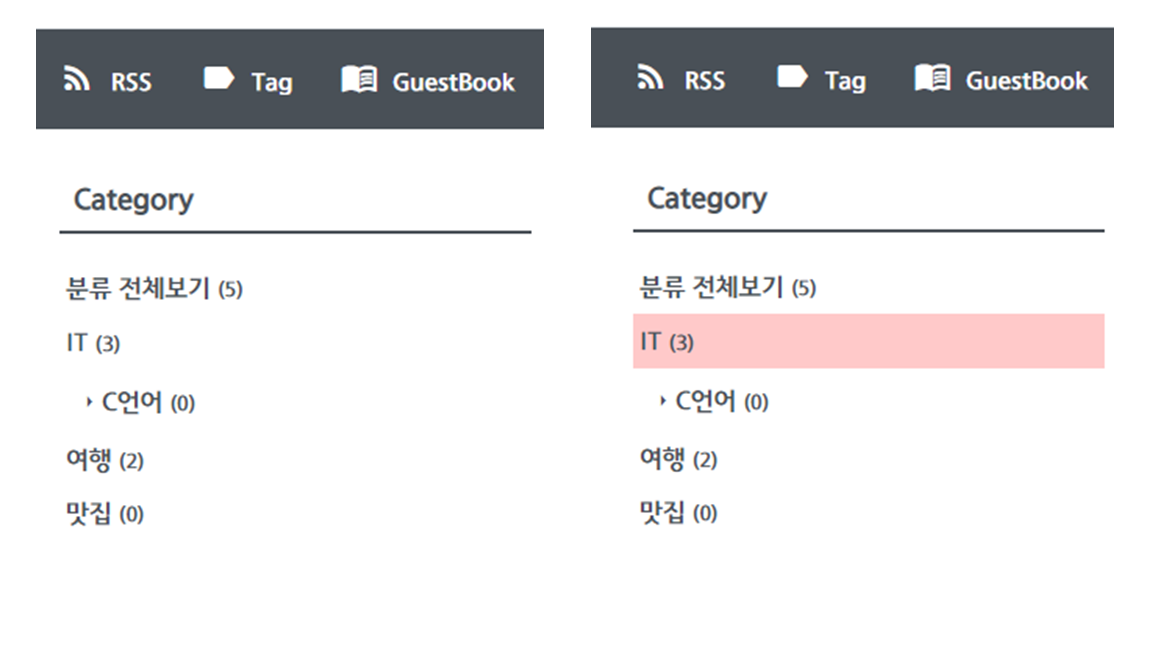 카테고리 항목에 마우스를 올리면 색상이 변하도록 하여 가독성을 높였습니다.