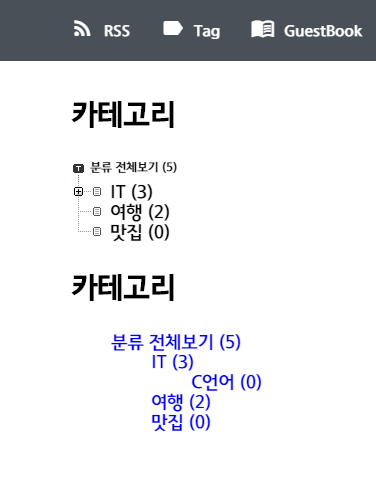 티스토리의 카테고리에는 2종류가 있네요. 첫번째와 같이 대략적으로 이미 디자인이 들어가 있는 경우가 있고, 밑에 부분은 디자인이 입혀지지 않은 경우네요.