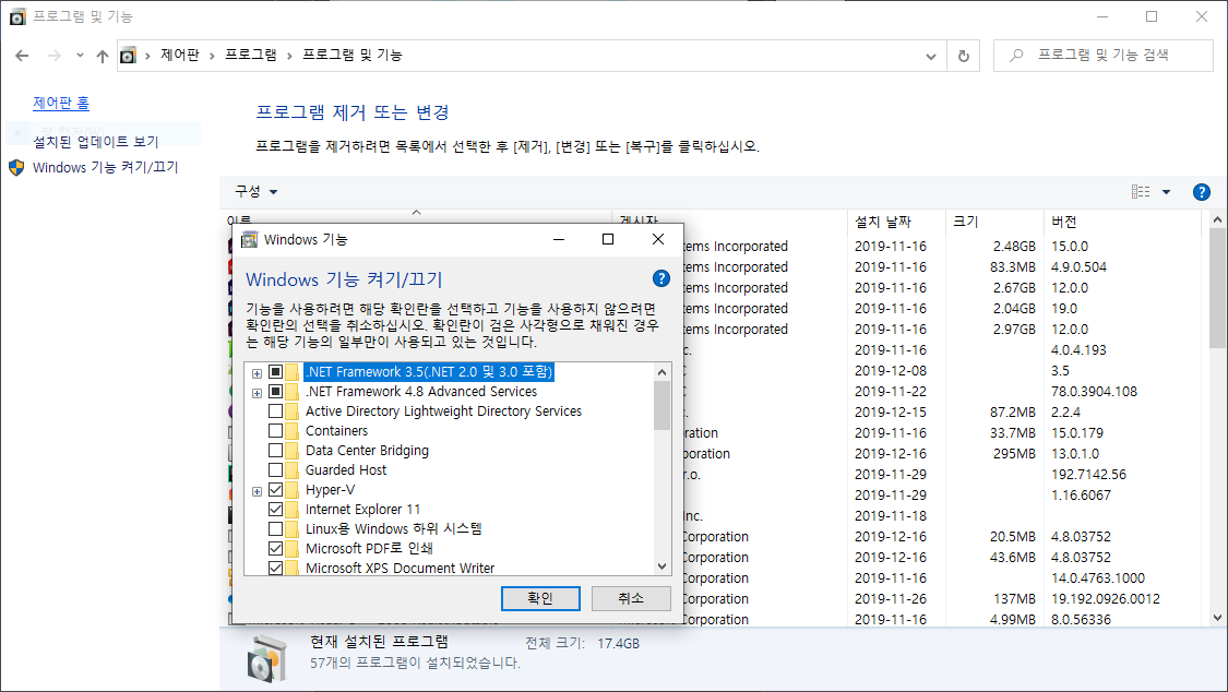 제어판 > 프로그램 > 프로그램 및 기능 > (왼쪽 서브메뉴) Windows 기능 켜기/끄기